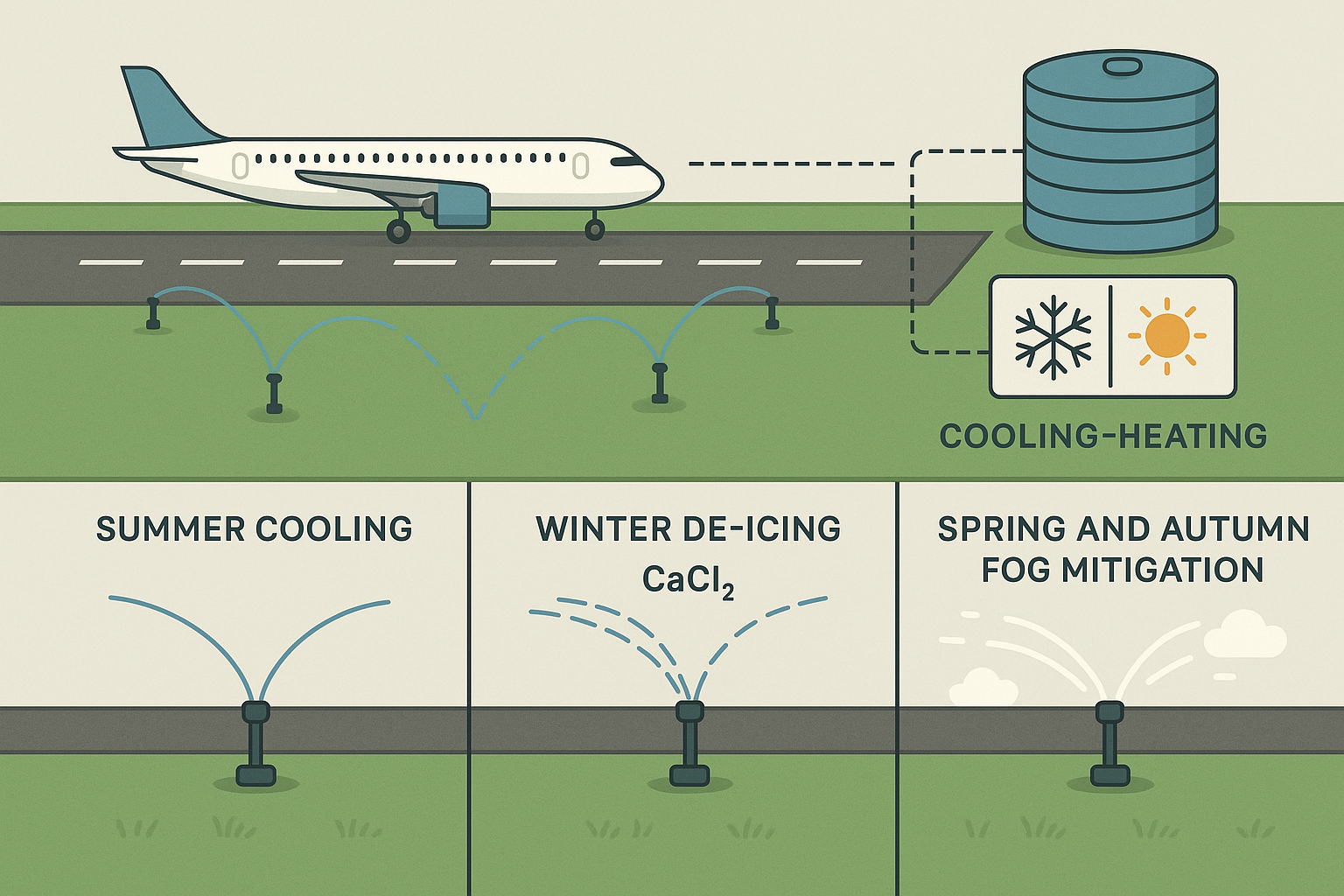 활주로 주변에 스프링클러를 설치하고, 계절·기상 상황에 따라 냉각, 제빙, 안개 억제를 수행한다면 항공 안전과 운영 효율성을 동시에 높일 수 있습니다.